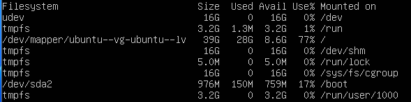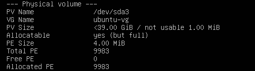 - target인 /dev/mapper/ubuntu--vg-ubuntu--lv가 39G임