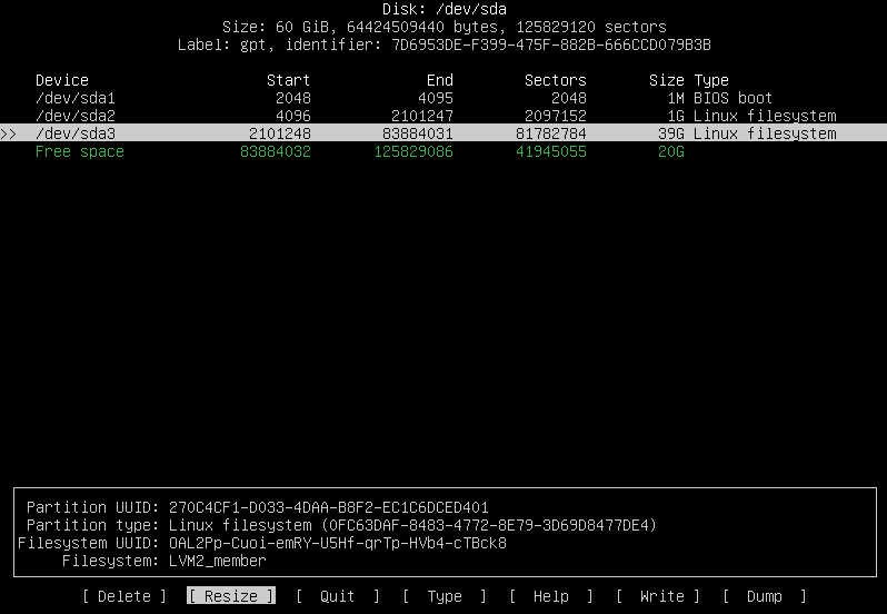 - /dev/sda3는 여전히 39G로 기존 40G 때 생성된 size로 보임