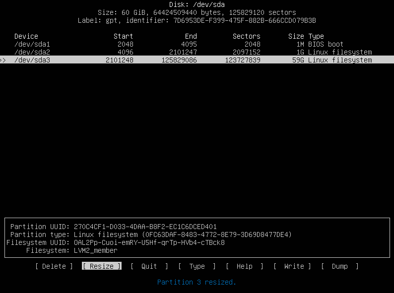 # sudo pvresize /dev/sda3